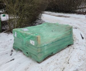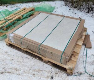 Płytki opaskowane są w kilku miejscach plastikowymi taśmami – dodatkowo nałożony jest gruby, foliowy kaptur, termozgrzewalny – który chroni płytki przez warunkami atmosferycznymi.
